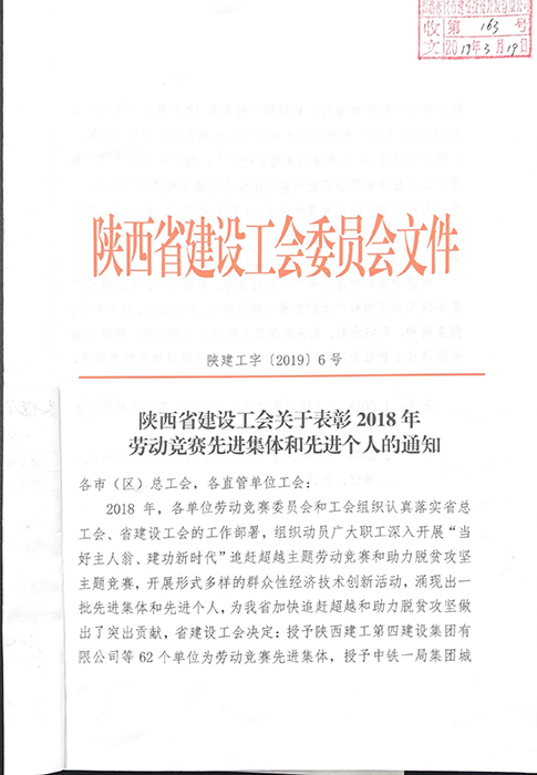 2018年,市城投公司認(rèn)真落實(shí)市委、市政府以及市總工會的工作部署,緊扣時代脈搏,強(qiáng)化責(zé)任擔(dān)當(dāng),以“當(dāng)好主人翁、建工新時代”追趕超越主題勞動競賽為抓手,組織員工建功立業(yè),促進(jìn)員工創(chuàng)新創(chuàng)造,充分激發(fā)了員工立足崗位、發(fā)憤圖強(qiáng)的內(nèi)動力,凝聚了追趕超越、克難攻關(guān)的精氣神,有力推動了公司提質(zhì)增效、快速健康發(fā)展。3月21日,經(jīng)市總工會推薦,省建設(shè)工會決定:授予商洛市城市建設(shè)投資開發(fā)有限公司為勞動競賽先進(jìn)集體。