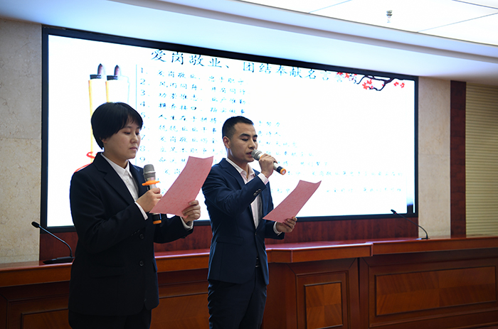 田力、陳瓊帶領(lǐng)全體員工誦讀"愛崗敬業(yè)、團(tuán)結(jié)奉獻(xiàn)"名言警句