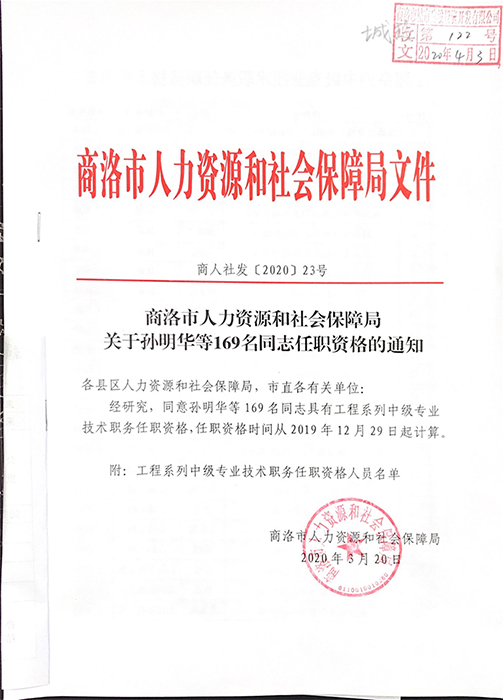 根據(jù)商洛市人力資源和社會保障局 “關(guān)于孫明華等169名同志任職資格的通知” 商人社發(fā)〔2020〕23號精神,我公司屈濤取得工程系列中級專業(yè)技術(shù)職務(wù)任職資格;孫啟航、王斐、李博維分別取得工程系列初級專業(yè)技術(shù)職務(wù)任職資格,任職資格從2019年12月29日起計算。