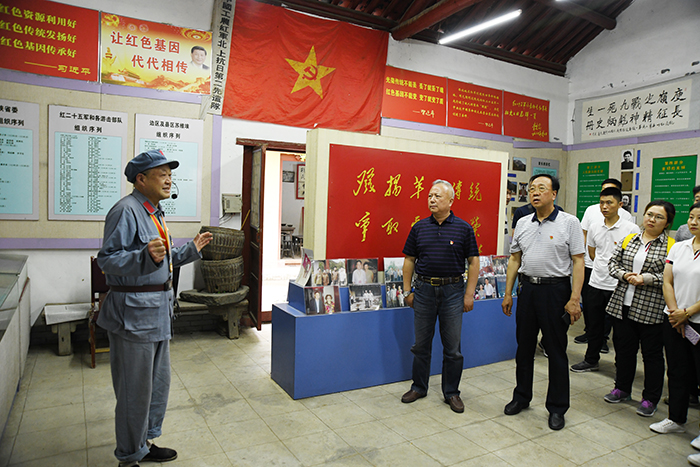 隨后,伴著蜿蜒的盤山公路,同志們來到了丹鳳縣庾嶺鎮(zhèn)“春茂永”中藥鋪,也是中共鄂豫皖省委第十八次常委會議舊址,聆聽了共產(chǎn)黨員楊青山同志的講解,跟隨楊青山同志參觀了紅二十五軍戰(zhàn)斗遺址,身臨其境的感受了當時紅二十五軍在庾家河戰(zhàn)役中的艱難處境及戰(zhàn)士們殊死奮戰(zhàn)、不怕犧牲、奮勇當前的英勇精神。庾嶺山脊上靜默的無名烈士墓、掩藏于樹叢中的庾家河戰(zhàn)斗紀念亭,以及程子華、徐海東受傷處的紀念碑,這一切都在向每位黨員訴說著那段不平凡的歲月。在庾家河戰(zhàn)斗紀念碑前,全體黨員同志舉起右手,莊嚴宣誓,重溫了入黨誓詞,鏗鏘有力的聲音回響在于家河上空以告慰英靈。